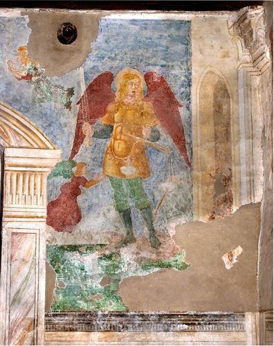 Sulla controfacciata è dipinta la figura di San Michele Arcangelo, pesatore di anime